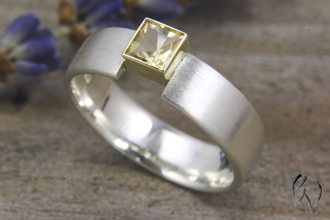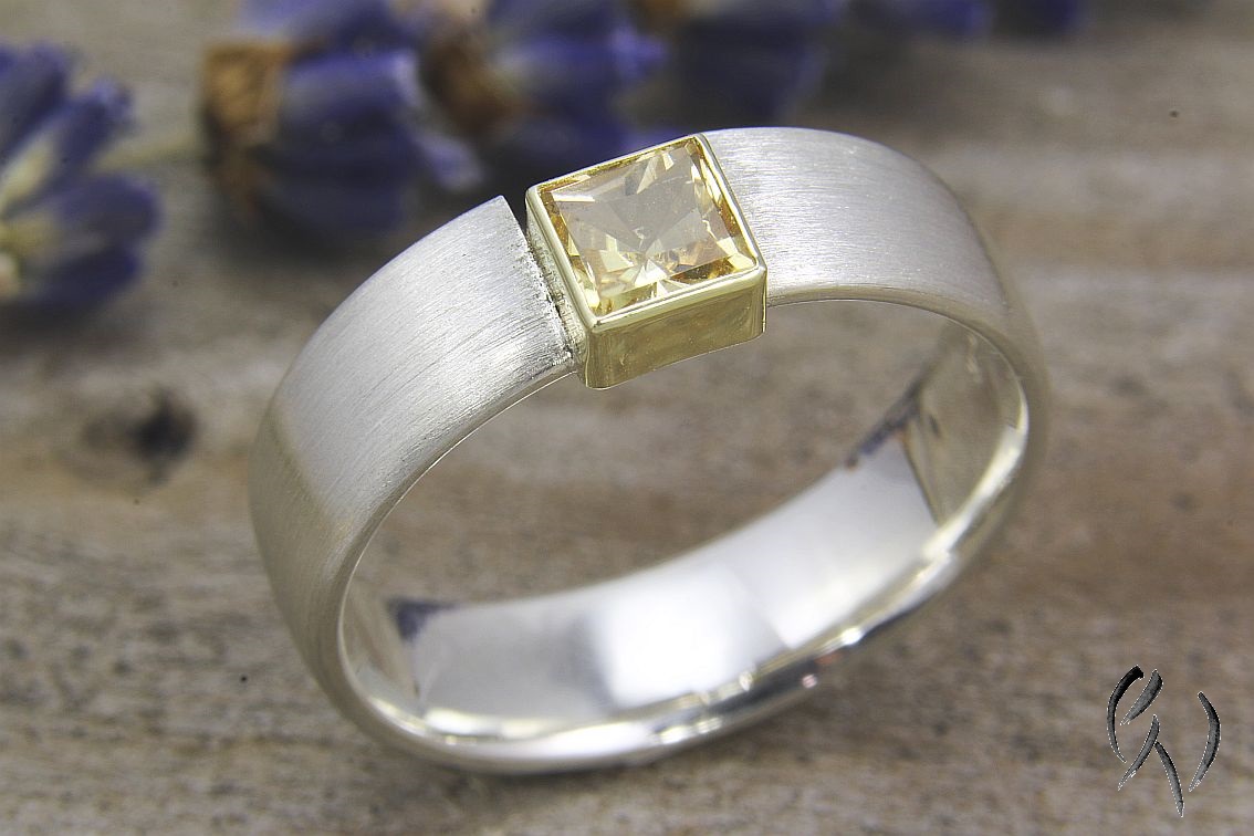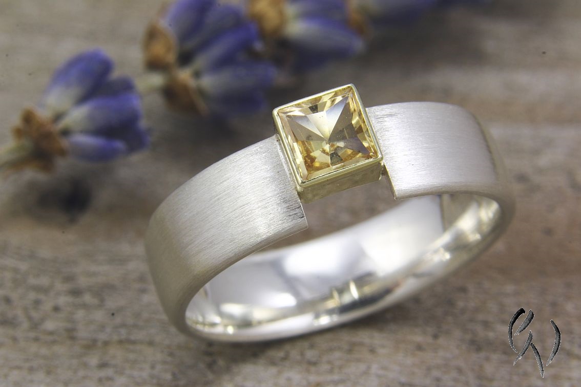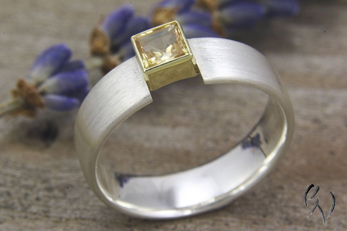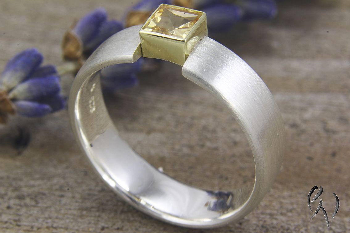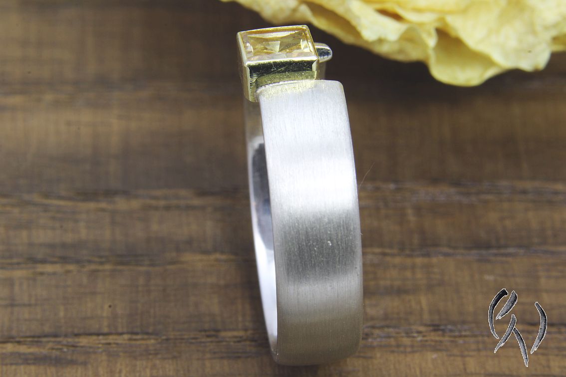 Die Ringschiene ist flach mit abgerundeten Seiten. Oben habe ich leicht zur Seite verschoben eine Fassung aus Gold mit einem gelben, quadratischen Turmalin eingesetzt. Durch die Öffnung vom Ring wirkt der Stein wie eingespannt, wird aber sicher gehalten. Das Goldgelb der Fassung unterstützt die Farbe des Turmalins noch zusätzlich.