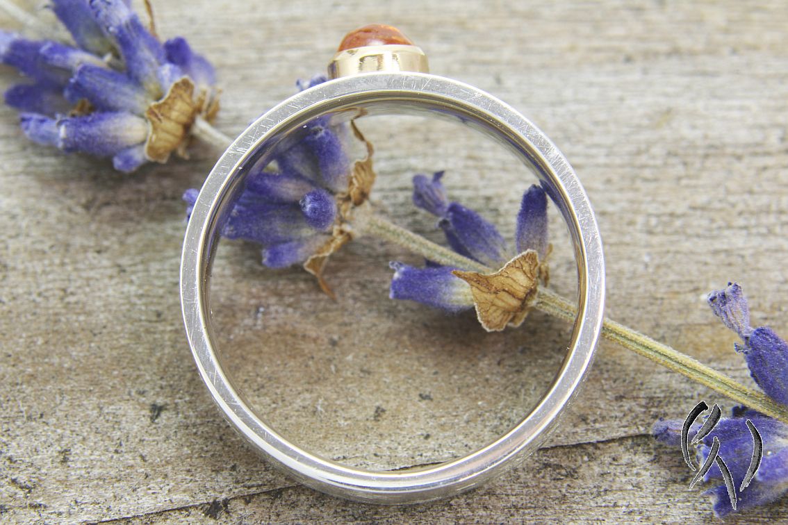 Auf die flache Ringschiene habe ich leicht zur Seite versetzt eine Fassung aus Roségold aufgelötet. Darin ist ein Mandaringranat im Cabouchonschliff eingefasst.