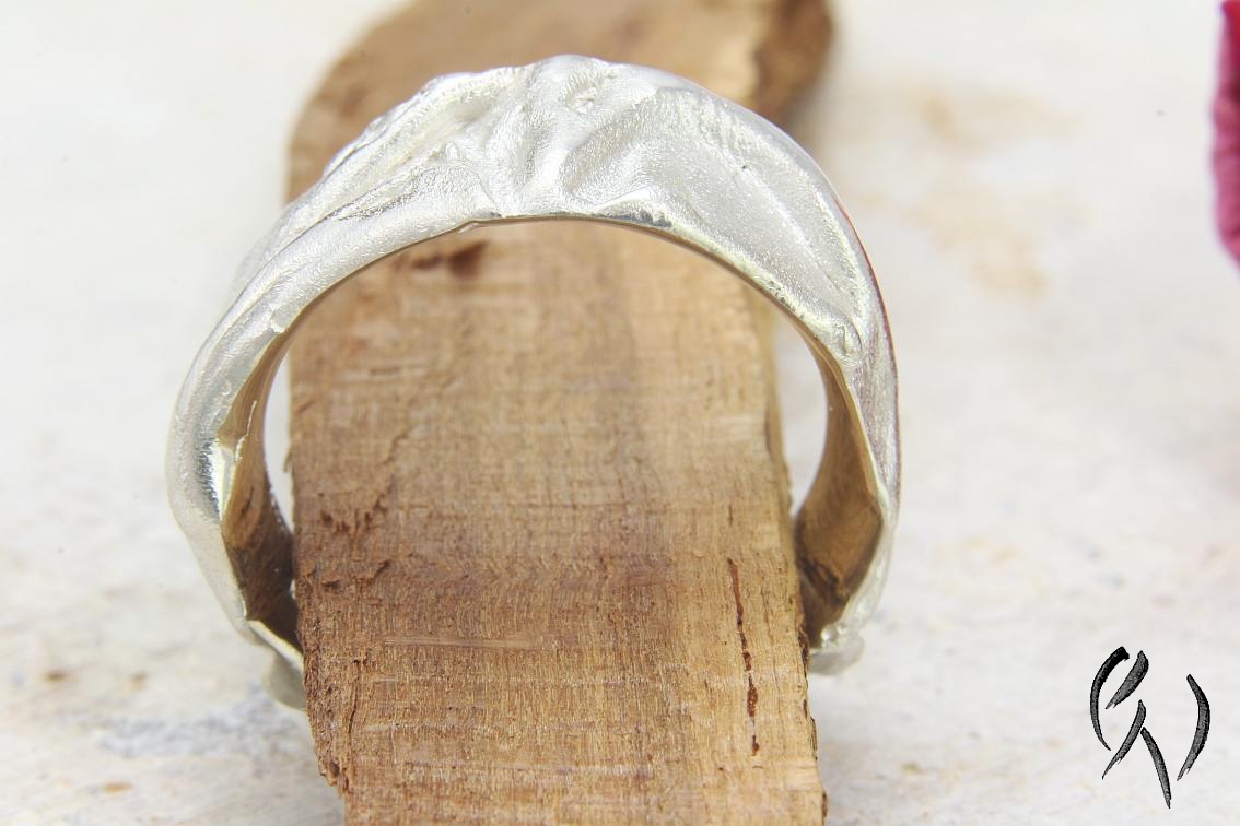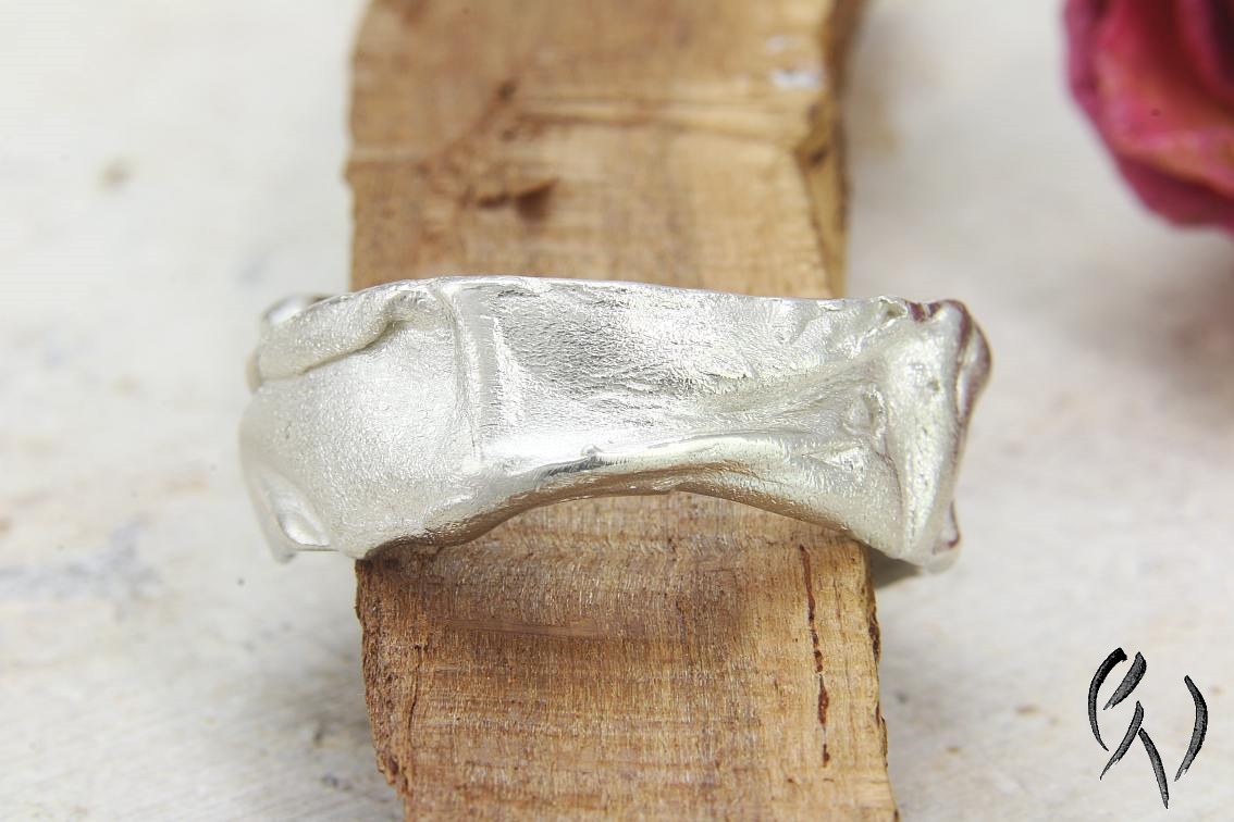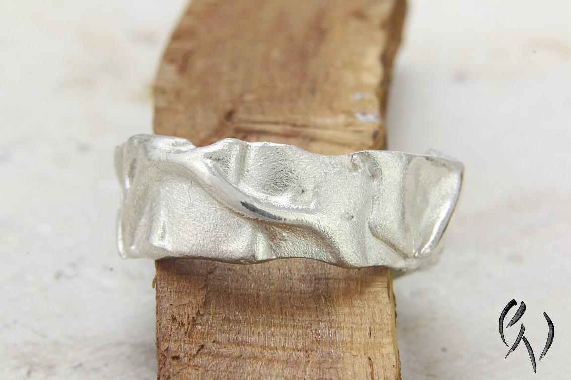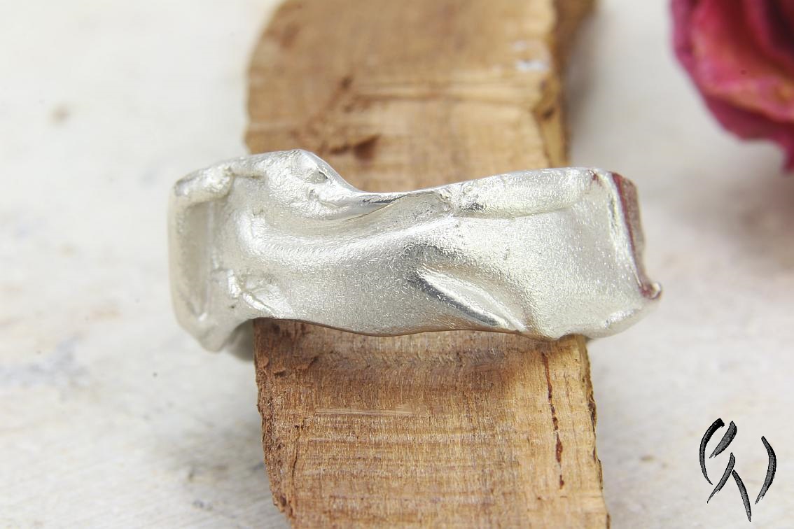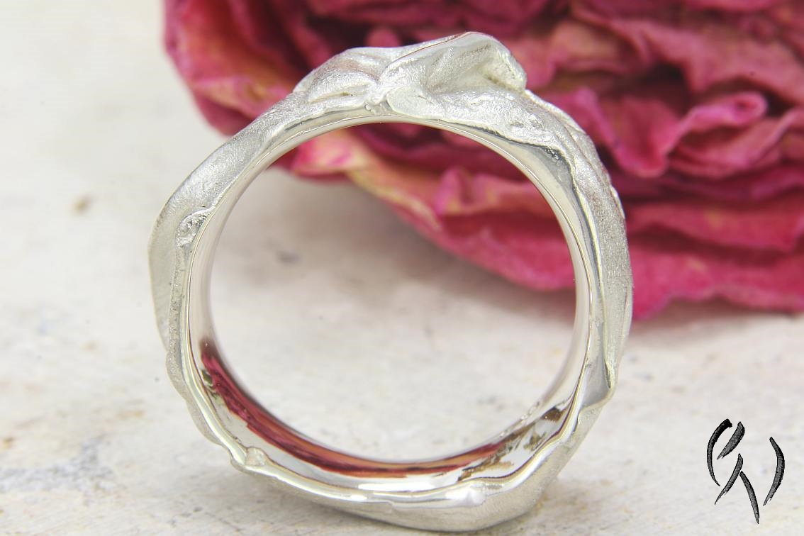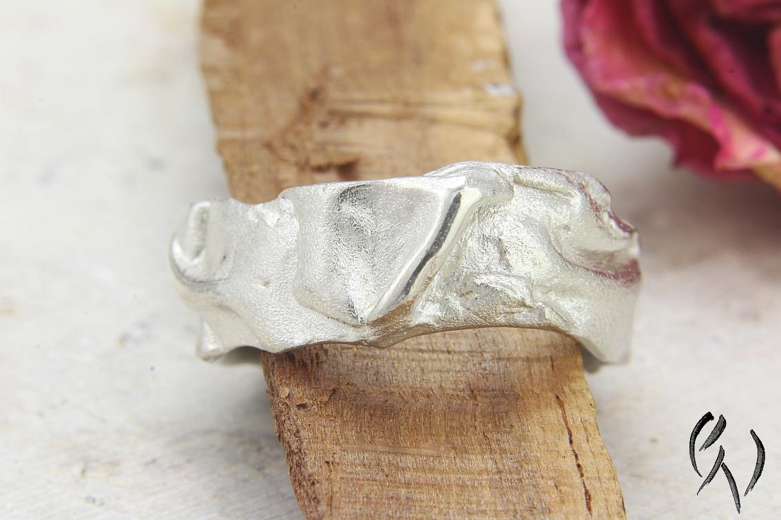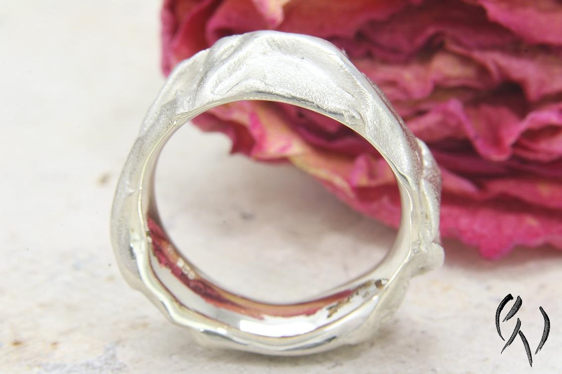 Dieser schöne Ring aus Silber 925/- hat seine Wirkung durch das Zusammenspiel von dem polierten und mattierten Silber auf der unregelmäßigen Oberfläche.