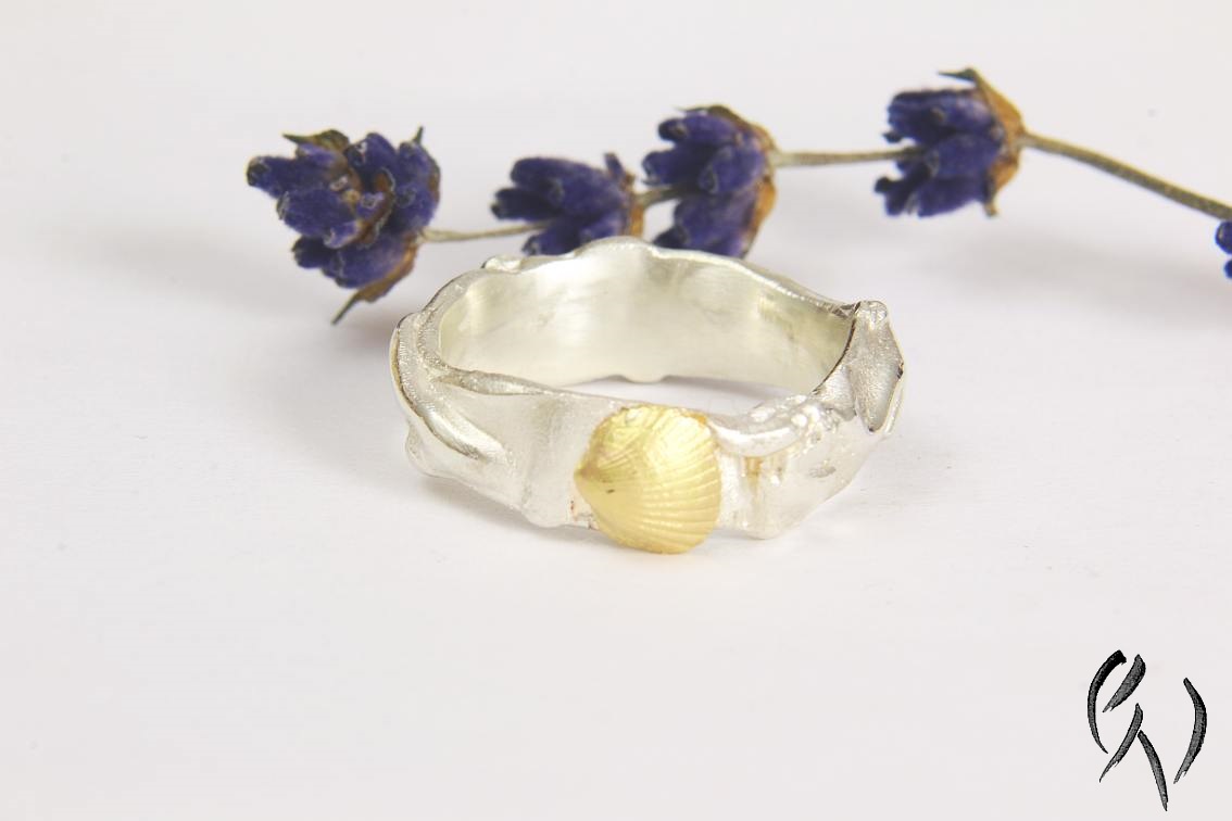 So entstand ein schmaler Silberring in dem skandinavischen Stil, in den sich eine kleine Muschel aus Gold 750/- einfügt. Das Zusammenspiel von dem polierten und mattierten Silber auf der unregelmäßigen Oberfläche verbindet sich mit dem matten Schimmer des Goldes zu einen schönen, ungewöhnlichen Schmuckstück.
