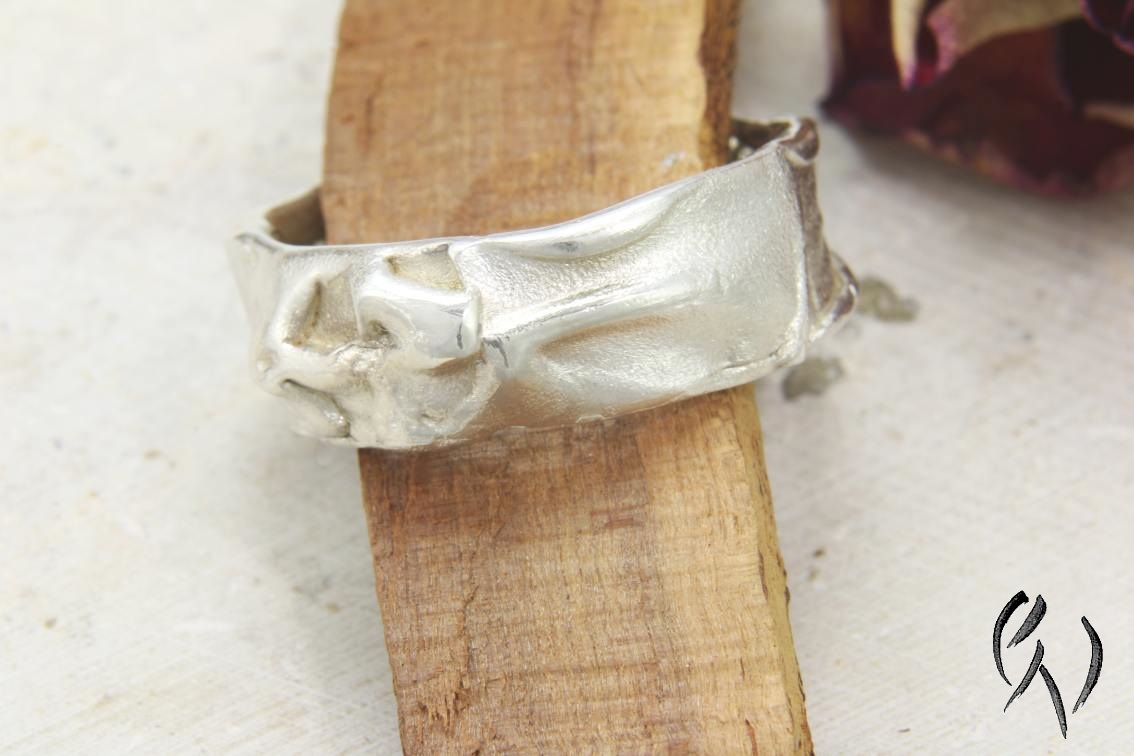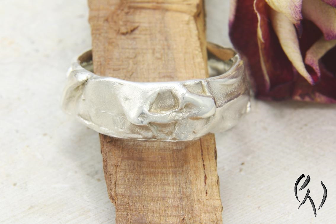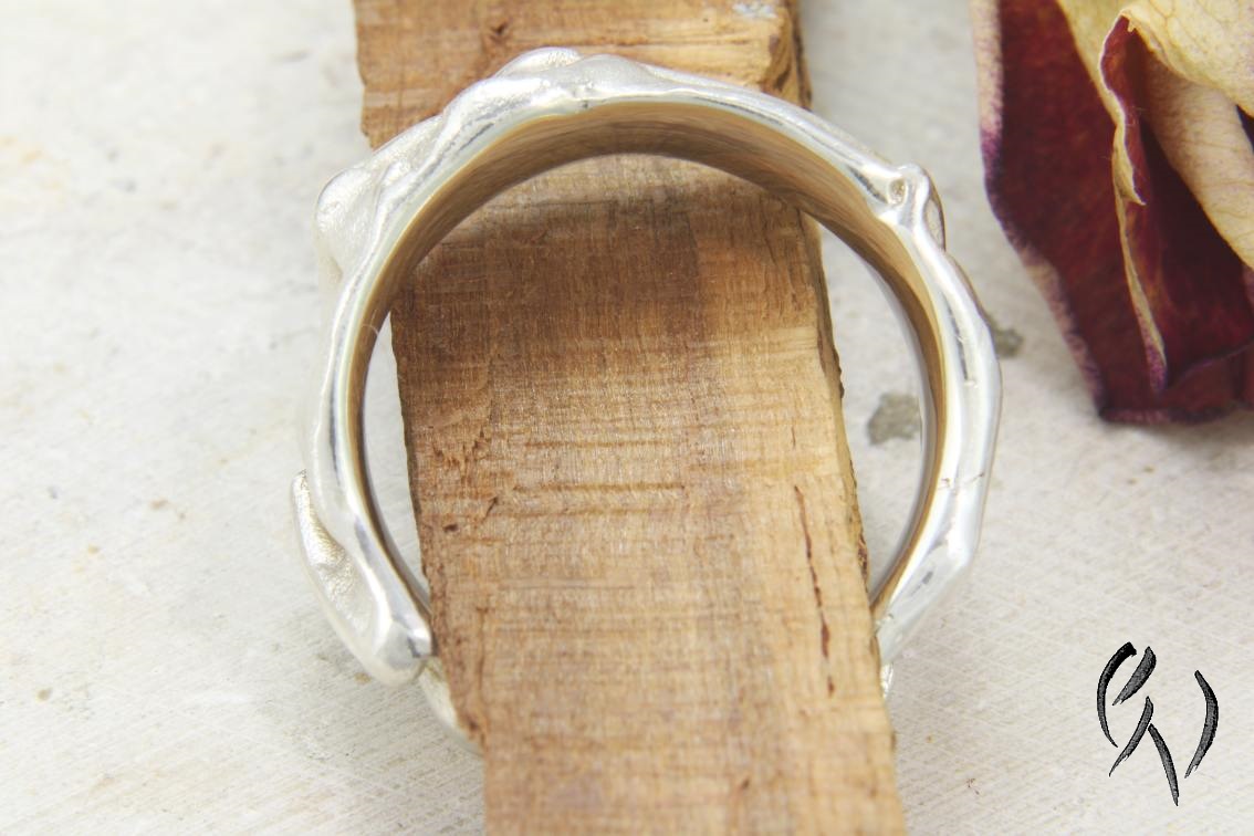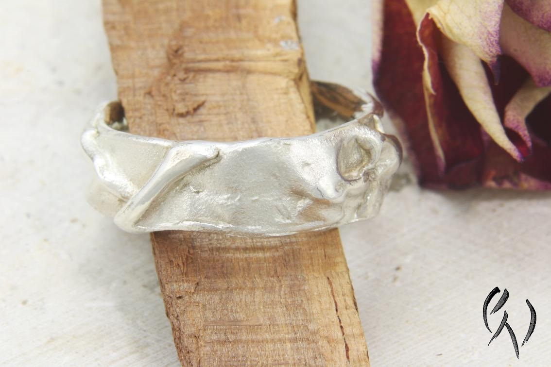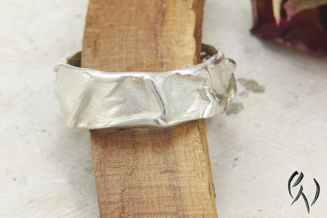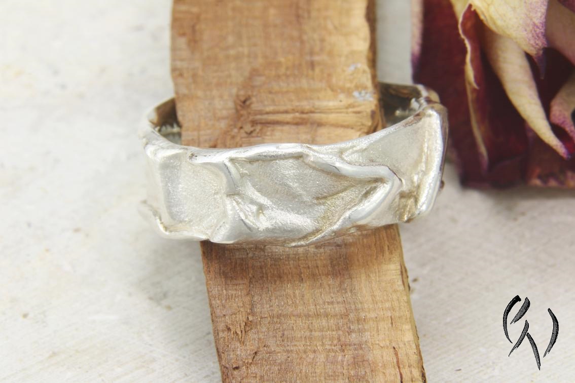 Dieser schöne Ring aus Silber 925/- hat seine Wirkung durch das Zusammenspiel von dem polierten und mattierten Silber auf der unregelmäßigen Oberfläche.