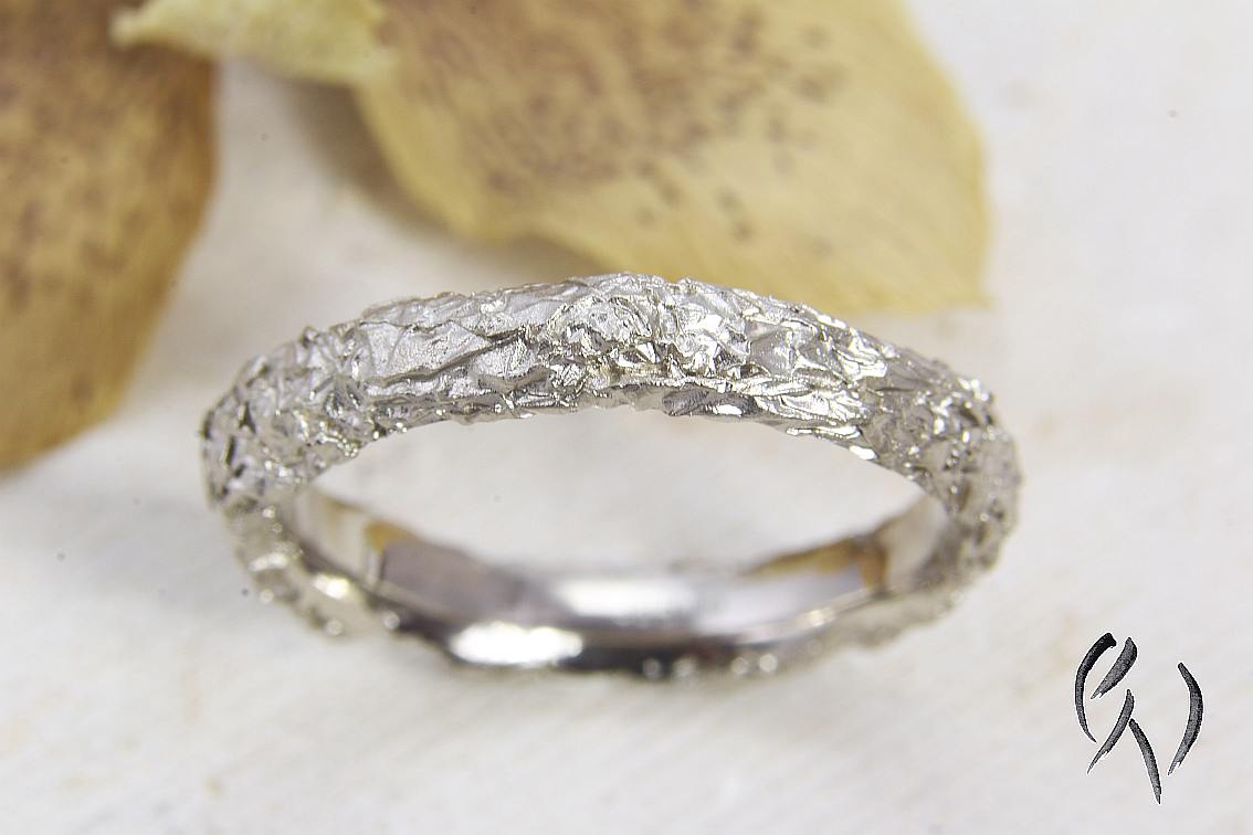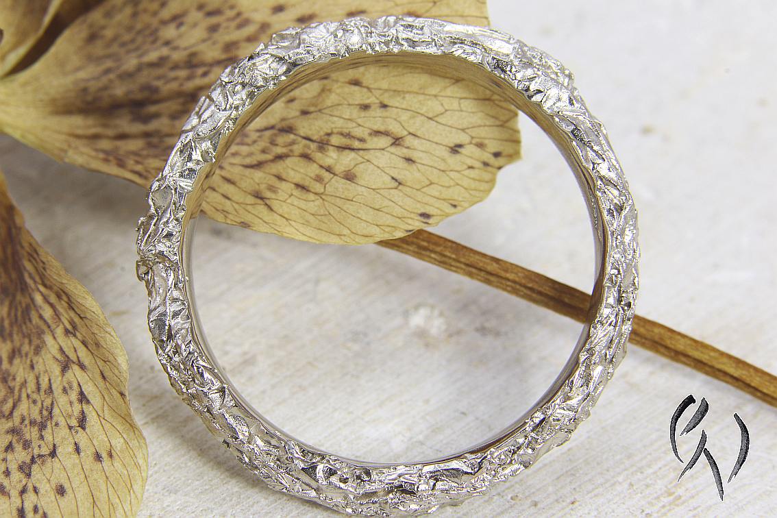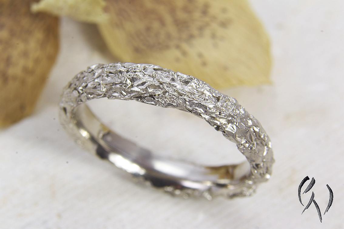 Dieser Ring aus Weißgold 585/- hat eine absolut außergewöhnliche Oberfläche: Außen ist er völlig zerknittert. Diese Oberfläche wurde von mir entwickelt und macht diesen Ring zu etwas ganz Besonderem. Die Innenseite ds Ringes ist jedoch weich abgerundet und damit angenehm zu tragen.