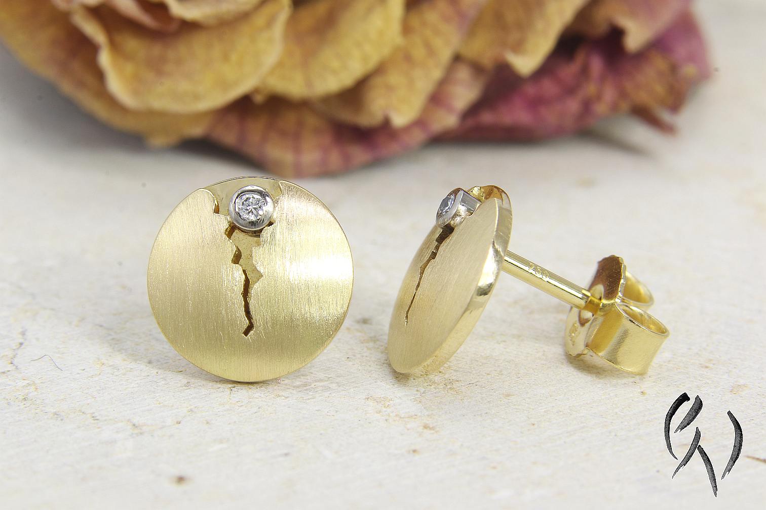 Auf der Oberfläche zieht sich von oben bis fast unten ein Riß durch den Ohrstecker. In dem oberen, breiten Teil ist eine Weißgoldfassug eingesetzt, in der ein kleiner Brillant von 0,01ct w/si eingesetzt ist. An den Stellen, wo man durch den Riß durchsehen kann, kommt die polierte Fläche der Rückseite zum Vorschein.