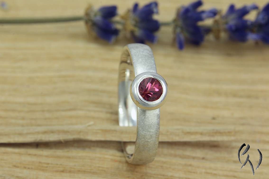 Darin ist ein pinkfarbener Turmalin eingefasst.
