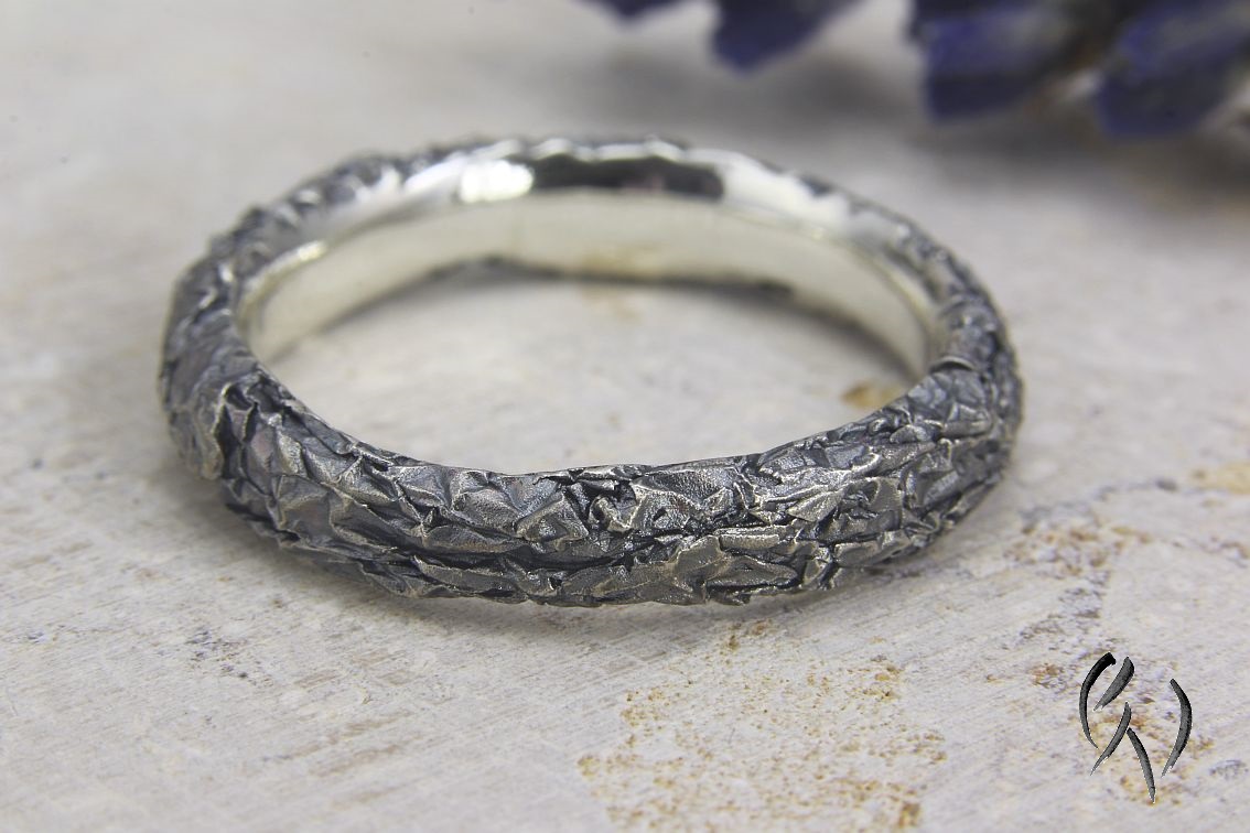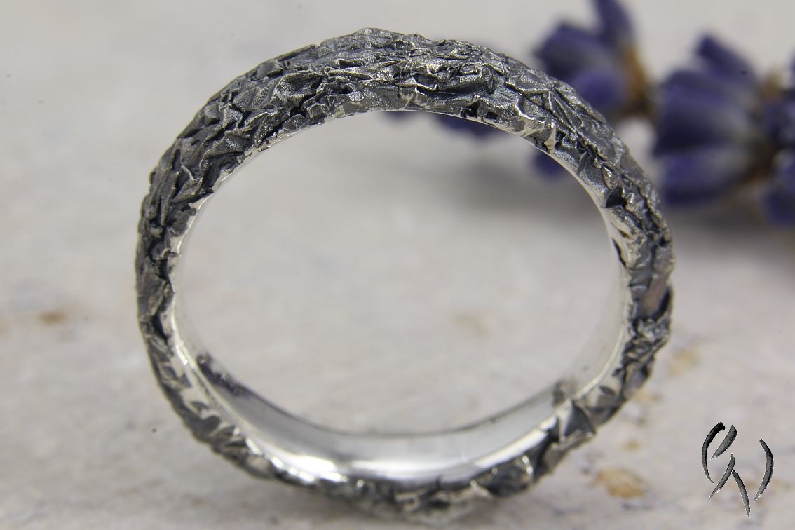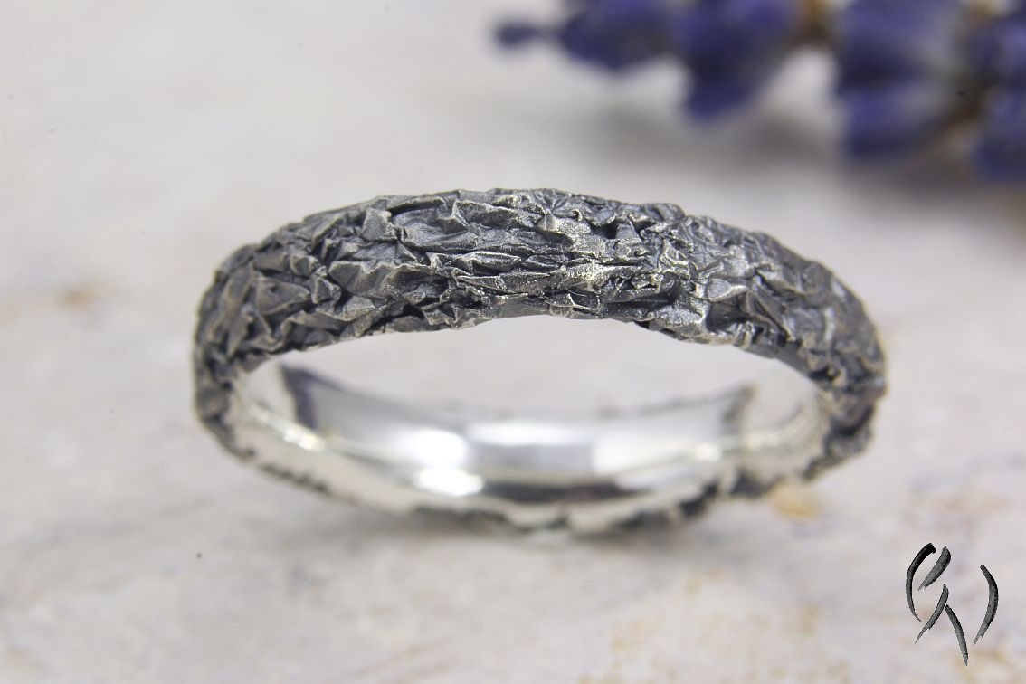 Wie bei allen Ringen dieser Serie hat auch dieser eine Oberfläche, die wie zerknitterte Folie aussieht. Der Querschnitt von dem Ring ist oval. Bie dieser Ausführung habe ich die Oberfläche geschwärzt. Dadurch bekommt die Knitterstruktur eine ganz andere Wirkung als bei den silbernen Ringen