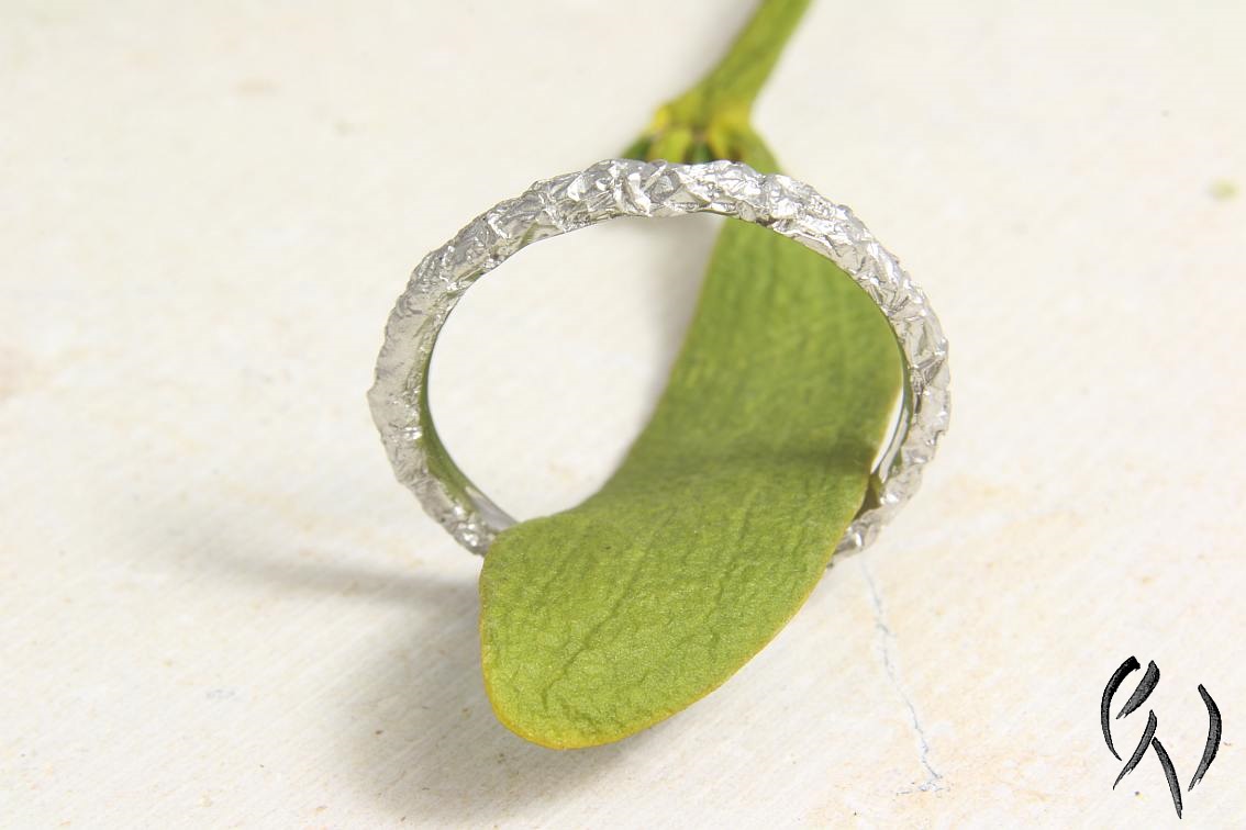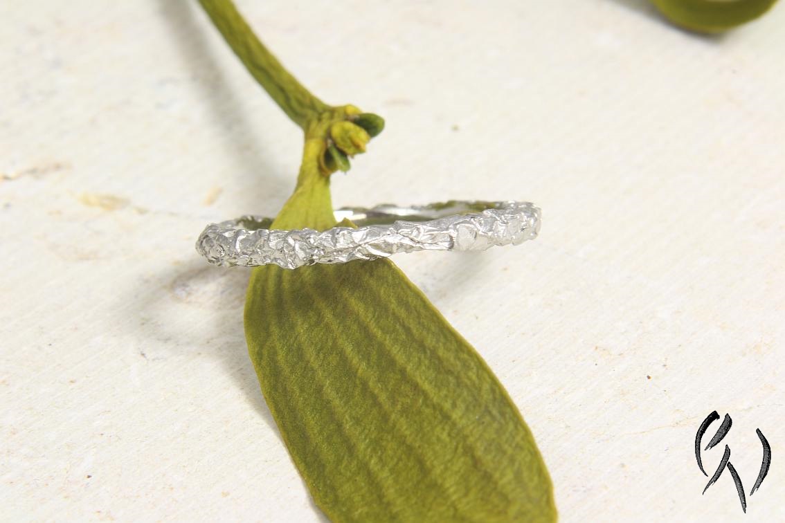 Wie bei allen Ringen dieser Serie hat auch dieser eine Oberfläche, die wie zerknitterte Folie aussieht. Der Querschnitt von dem Ring ist rund bis oval, er ist ca 2 mm breit bzw schmal.