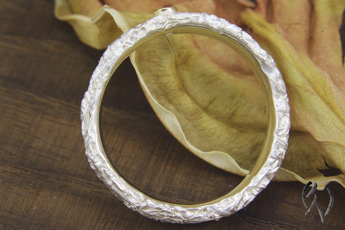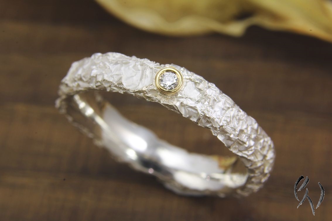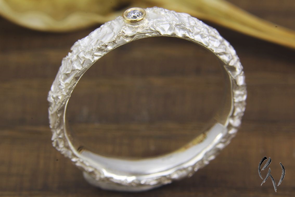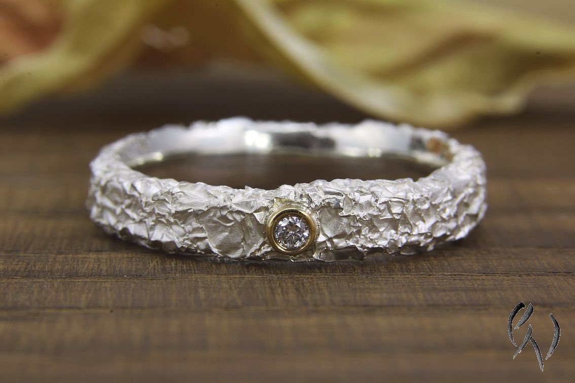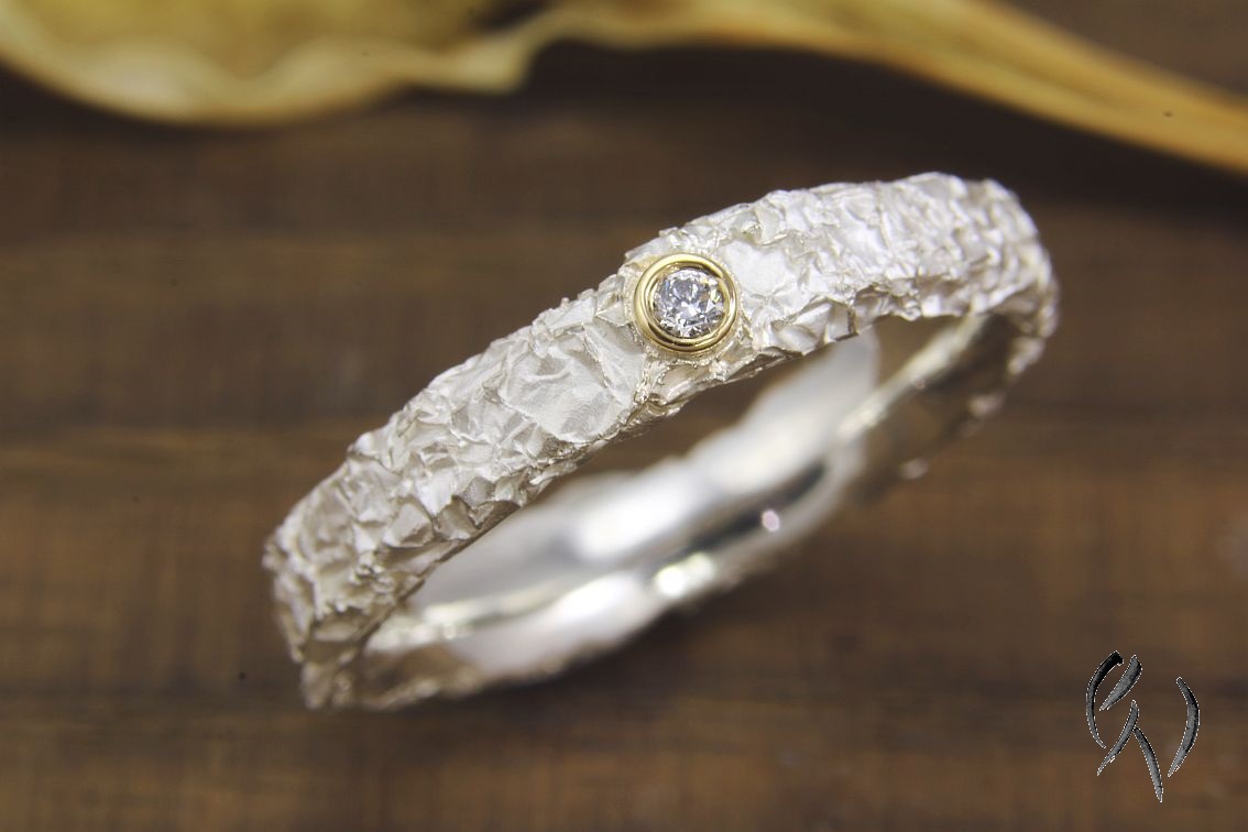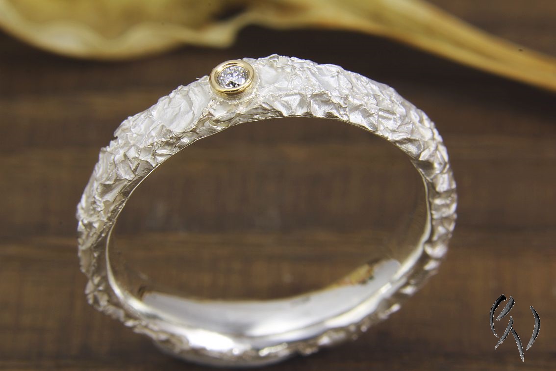 Der Ring hat die typische zerknitterte Oberfläche, die goldene Fassung ist poliert