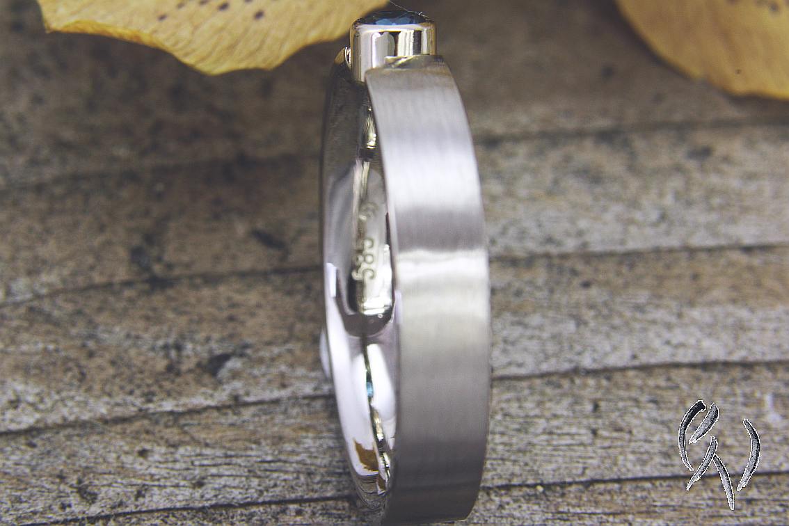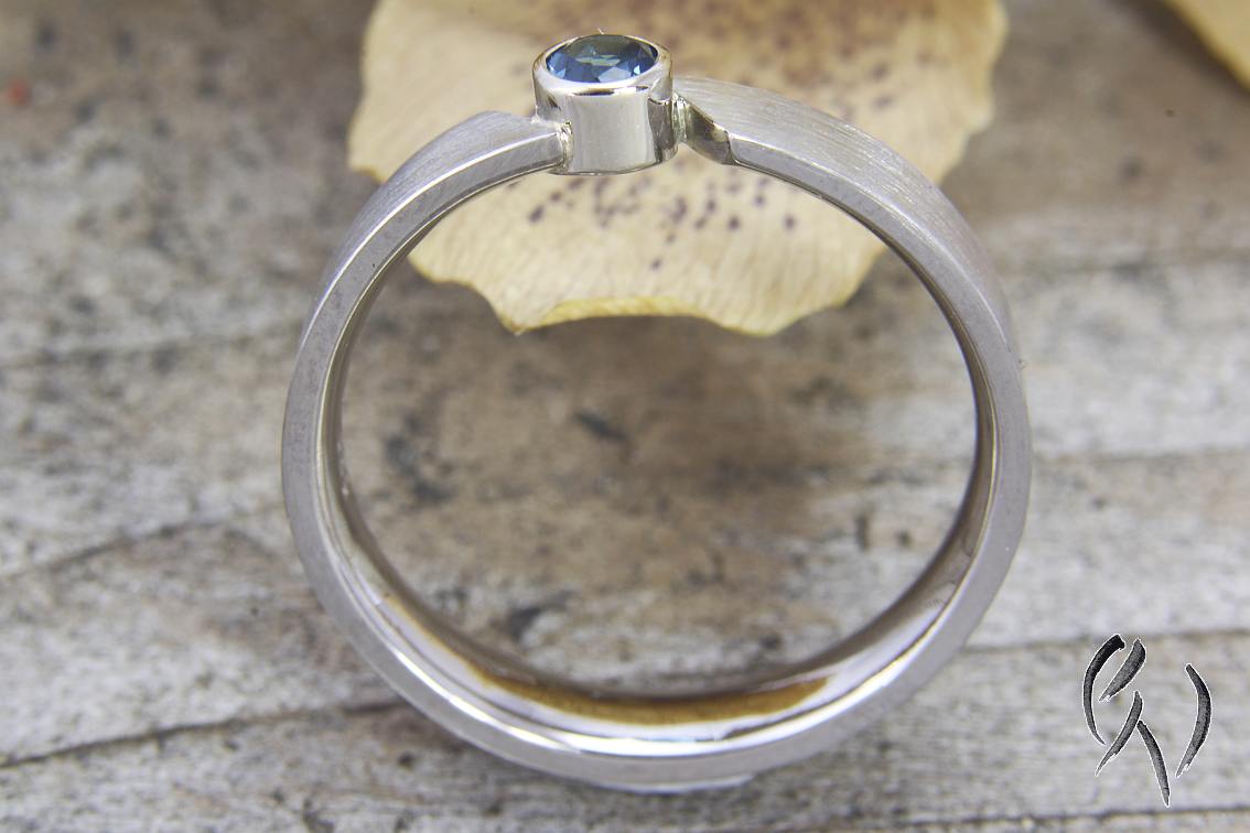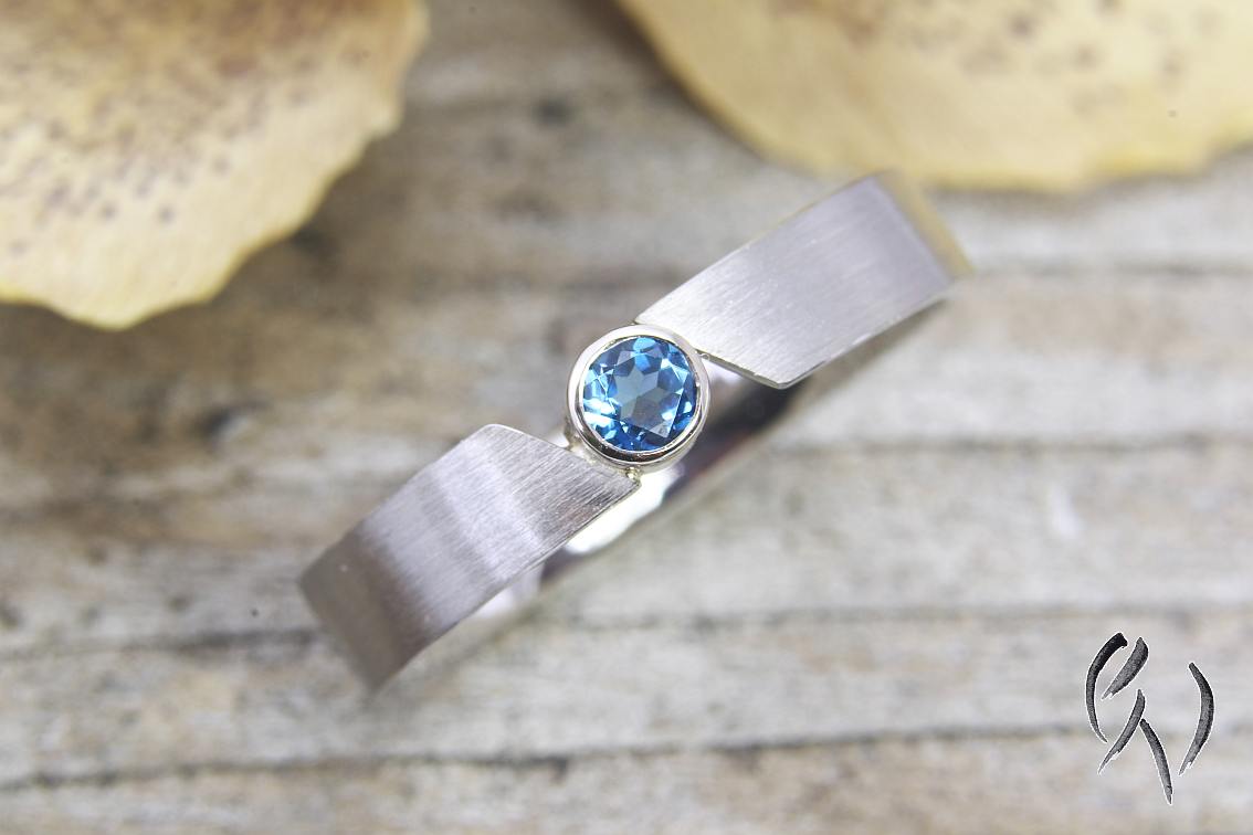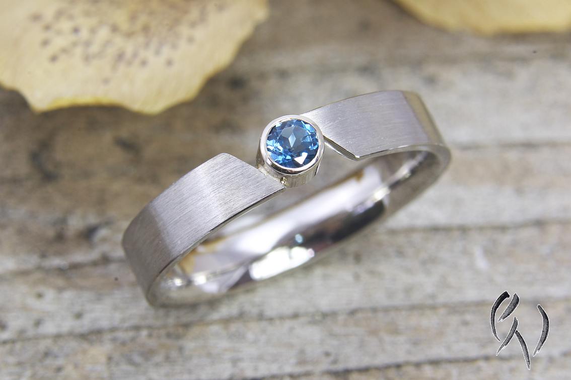Die gerade, flache Ringschiene wird von einer schrägen Öffnung unterbrochen. Darin ist eine Weissgoldfassung mit einem kleinen, blauen Topas eingesetzt.